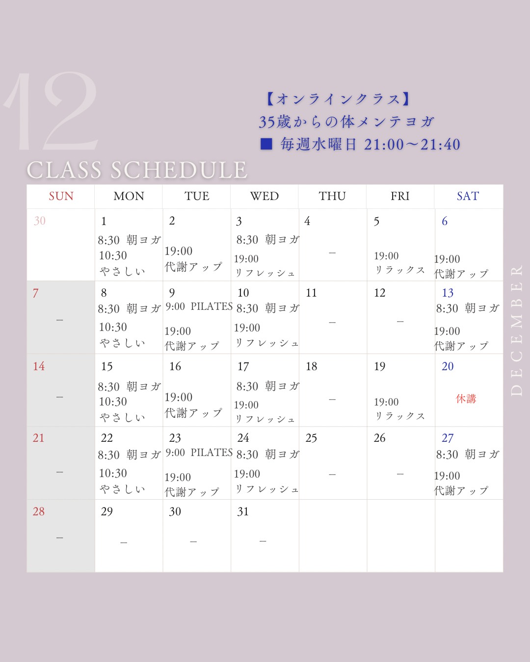 12月のクラススケジュールと年末年始について